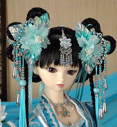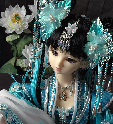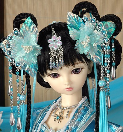 Adorn your doll in this breathtaking turquoise Hanfu ensemble, featuring intricate silver embroidery and flowing layers that capture the essence of ancient Chinese elegance. The set includes elaborate floral hairpins with dangling tassels and sparkling jewelry, creating a complete fairy-like look perfect for display or photography. Designed for collectors and enthusiasts of traditional culture, this high-quality costume transforms your ball-jointed doll into a graceful celestial maiden.