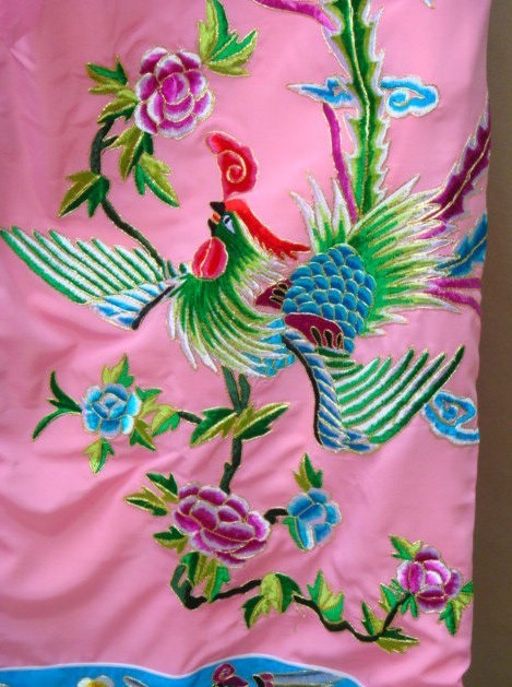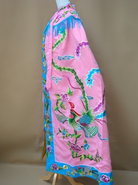 This exquisite pink cape features traditional Chinese embroidery with vibrant phoenixes and floral motifs, making it a stunning piece for Peking Opera performances. Crafted with striking blue borders and intricate detailing, it serves as a majestic outer garment for female Dan roles on stage. Ideal for theatrical productions, cultural showcases, or collectors, this cloak embodies the elegance and rich artistry of Chinese heritage.