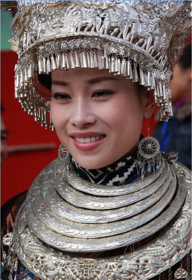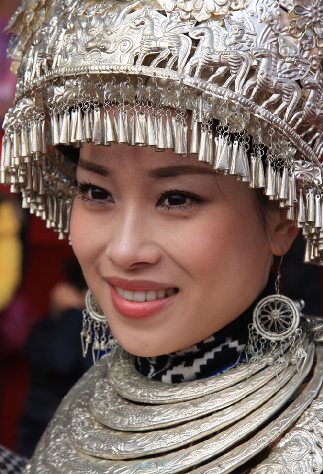 This stunning traditional Miao ethnic costume features a magnificent silver horn headdress and layers of intricate silver jewelry. The outfit showcases vibrant, hand-embroidered patterns on high-quality fabric, adorned with dangling silver pendants and colorful tassels. Perfect for cultural festivals, folk dance performances, or wedding ceremonies, this attire celebrates the rich heritage and craftsmanship of the Miao people. The ensemble is completed with heavy silver neck rings that symbolize wealth and beauty in traditional culture.