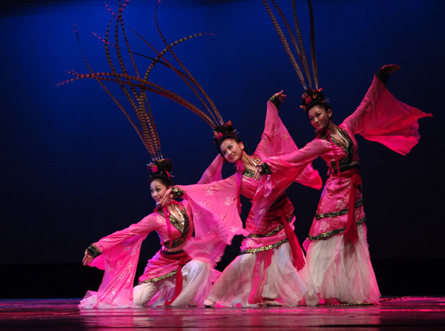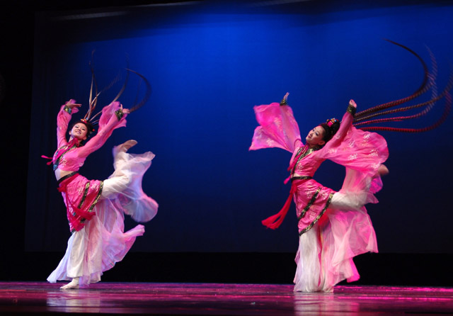 Traditional Chinese Classical Dance Costume Pink Flowing Dress with Pheasant Feather Headpiece for Women Stage Performance