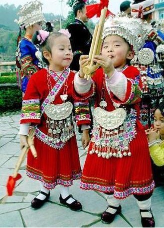 Traditional Chinese Miao Ethnic Minority Children Costume Complete Set with Silver Headdress for Kids Folk Dance Performance