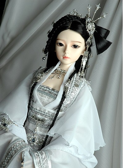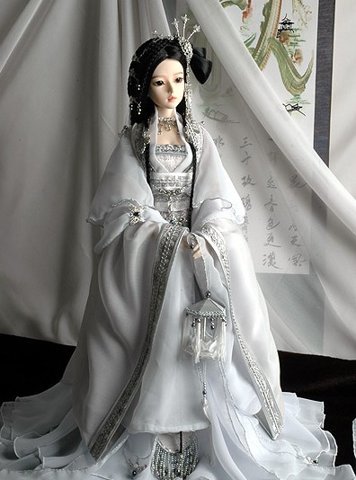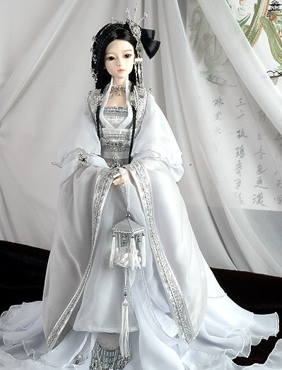 This exquisite white and silver Hanfu set features intricate metallic embroidery and flowing layers, perfectly tailored for 1/3 scale BJD dolls. Designed to reflect traditional Chinese bridal aesthetics, the ensemble includes a detailed chest panel, wide sleeves, and an ornate hairpiece. Ideal for doll collectors and cosplay photographers, this ancient-style outfit adds a majestic and cultural touch to any display.