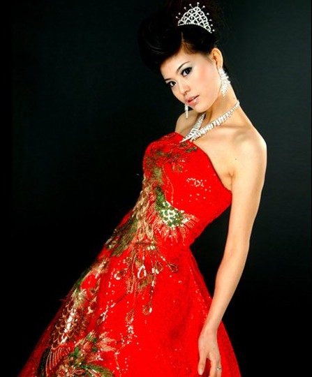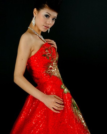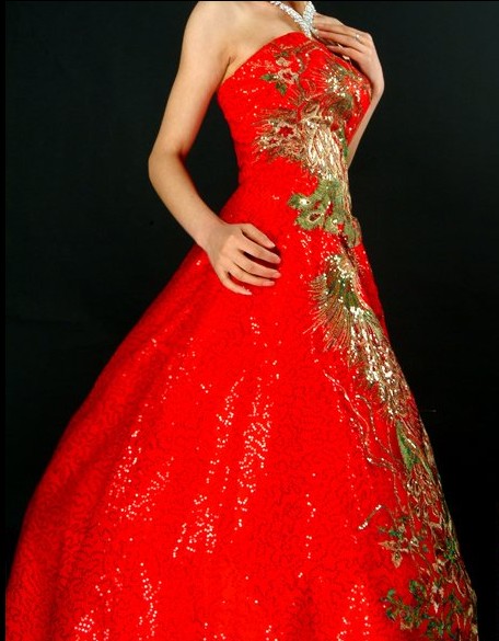 This stunning red gown blends traditional Chinese aesthetics with modern elegance, featuring intricate gold and green sequin embroidery of phoenix and peacock motifs. Designed for the bride, the strapless ballgown silhouette offers a majestic look perfect for wedding ceremonies, banquets, and traditional toasts. The vibrant red fabric symbolizes good fortune and joy, while the luxurious detailing reflects nobility and grace, making it a standout choice for cultural celebrations.