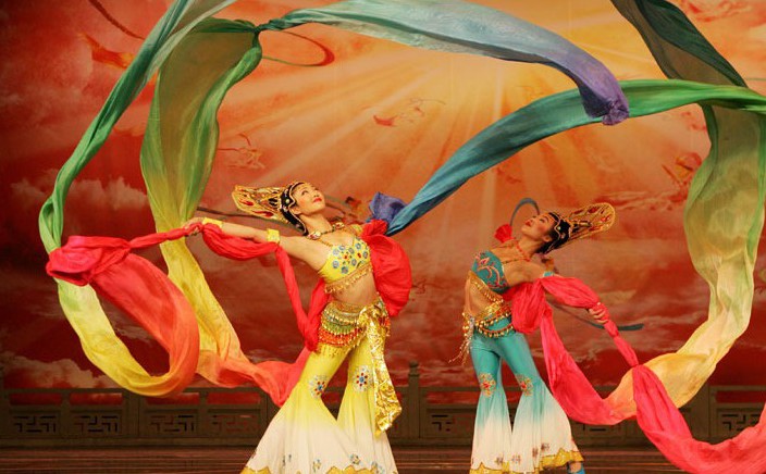 Women's Traditional Chinese Dunhuang Flying Apsaras Dance Costume with Long Silk Ribbons for Stage Performance