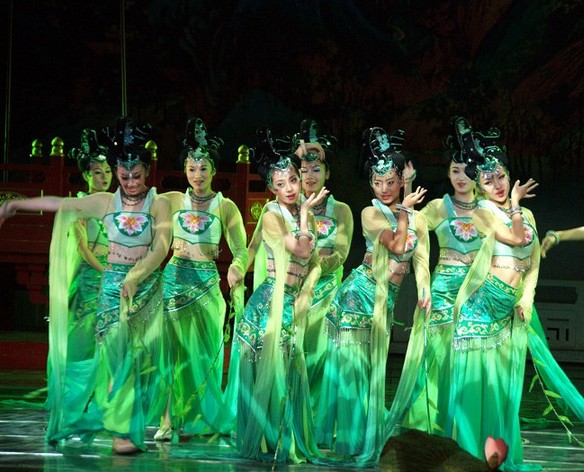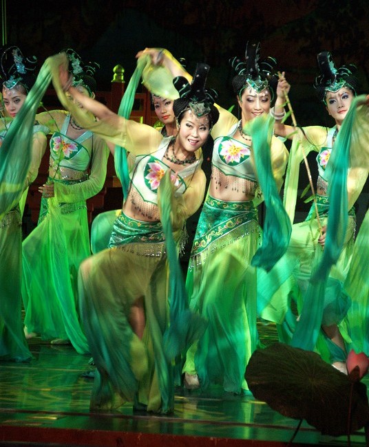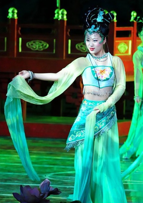 This stunning green costume set is designed for traditional Chinese folk dance, featuring an elegant peacock-inspired aesthetic perfect for captivating stage performances. The outfit includes a fitted embroidered crop top with flowing sheer "water sleeves" and a matching long skirt that enhances fluid, graceful movement. Complete with an elaborate matching headdress, this ensemble is crafted from lightweight, breathable fabrics to ensure comfort during dynamic choreography. Ideal for cultural showcases and dance troupes, this attire beautifully captures the vibrancy and artistic heritage of ancient Chinese dance traditions.