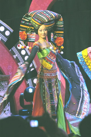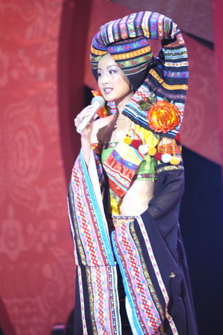 Showcase the vibrant beauty of Chinese heritage with this stunning ethnic minority folk dance costume, featuring a majestic, towering headdress adorned with colorful stripes and pom-poms. The ensemble includes an intricately embroidered top and flowing black robe with geometric patterns, crafted from durable fabrics designed for comfortable stage movement. Perfect for cultural performances, traditional festivals, and folk dance competitions, this complete outfit allows women to embody the rich artistic traditions of China's diverse ethnic groups.
