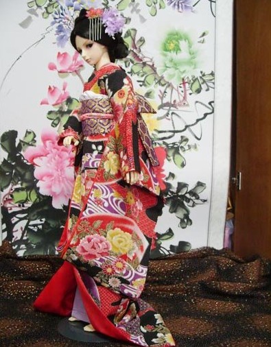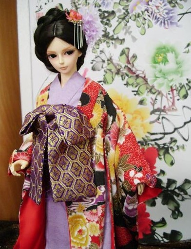 This exquisite doll costume features a vibrant Japanese kimono adorned with intricate floral patterns in red, gold, and yellow, capturing the elegance of traditional attire. The ensemble includes a detailed geometric obi sash, a flowing purple under-layer, and delicate hair ornaments to complete the authentic look. Perfect for fashion doll collectors and cultural enthusiasts, this outfit brings the sophistication of classic Geisha style to your display. Crafted with attention to detail, it serves as a beautiful tribute to Asian heritage and traditional craftsmanship.
