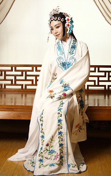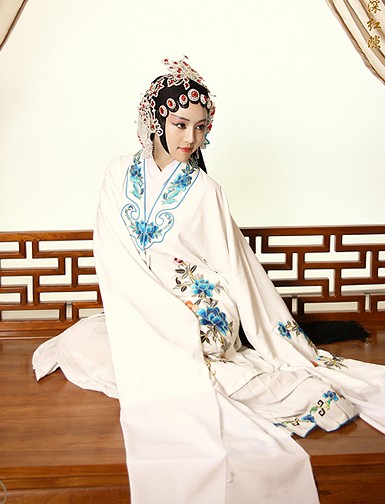 Immerse yourself in the elegance of traditional Chinese theater with this exquisite white opera costume, designed specifically for the graceful female Dan role. The robe showcases intricate floral and bird embroidery in vibrant hues against pristine fabric, complemented by signature long water sleeves that enable expressive, flowing movements essential for stage storytelling. This complete ensemble, including a detailed headdress, is crafted for durability and visual impact, making it ideal for professional opera performances, cultural showcases, and artistic photography. Embody the timeless beauty of Chinese heritage with this authentic and meticulously detailed garment.