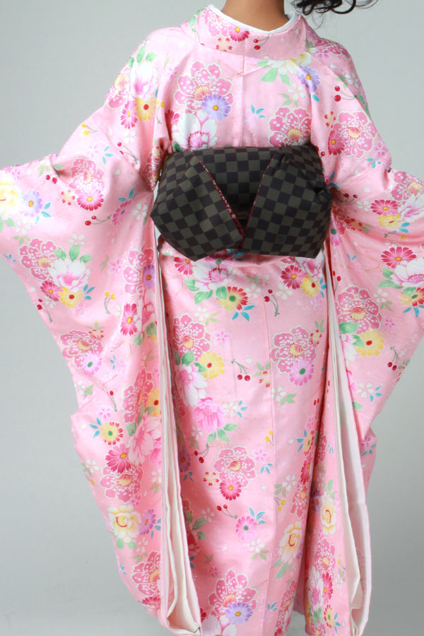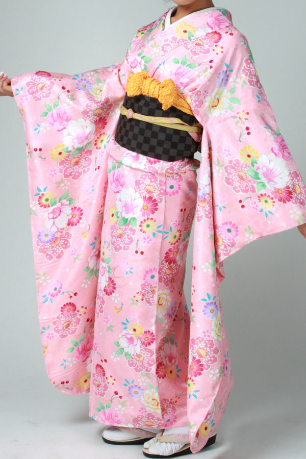 This elegant pink kimono features a vibrant floral print that captures the beauty of traditional Japanese aesthetics. Crafted from smooth, high-quality fabric, the set includes a contrasting woven obi sash to cinch the waist and complete the authentic look. Ideal for cultural festivals, stage performances, or cosplay events, this garment allows wearers to experience the timeless grace of historic fashion. The flowing wide sleeves and floor-length cut create a stunning silhouette suitable for any special celebration.