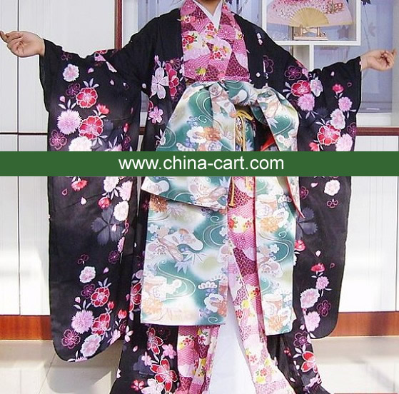 This stunning black furisode kimono features vibrant pink and white floral patterns, exuding elegance and traditional Japanese beauty. It is paired with an elaborate teal obi sash adorned with auspicious white cranes and flowing water motifs, symbolizing longevity and good fortune. Perfect for formal occasions such as weddings, coming-of-age ceremonies, or cultural festivals, this complete set offers an authentic experience. Crafted with attention to detail, the flowing sleeves and intricate designs make it a timeless piece for any traditional wardrobe.