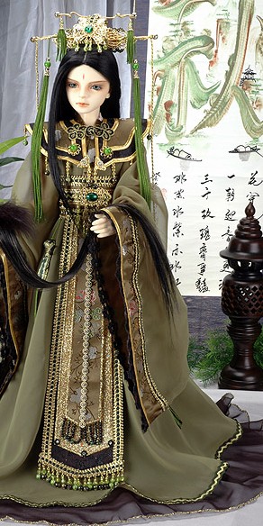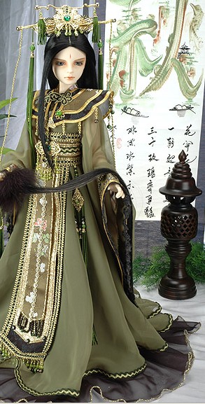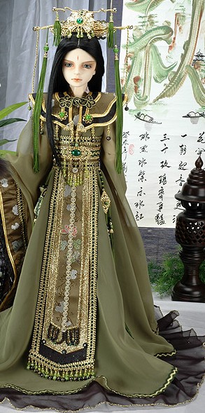 Elevate your doll collection with this exquisite traditional Chinese Hanfu costume set, featuring a regal olive green robe adorned with intricate gold embroidery and beadwork. The ensemble includes a stunning, elaborate headdress with dangling green tassels and golden ornaments, perfectly capturing the elegance of ancient Chinese nobility. Designed specifically for Ball Jointed Dolls (BJD) or similar fashion dolls, this outfit is ideal for historical cosplay, professional photography, and display. Immerse yourself in the beauty of Oriental aesthetics with this high-quality craftsmanship that brings the fantasy of ancient dynasties to life.