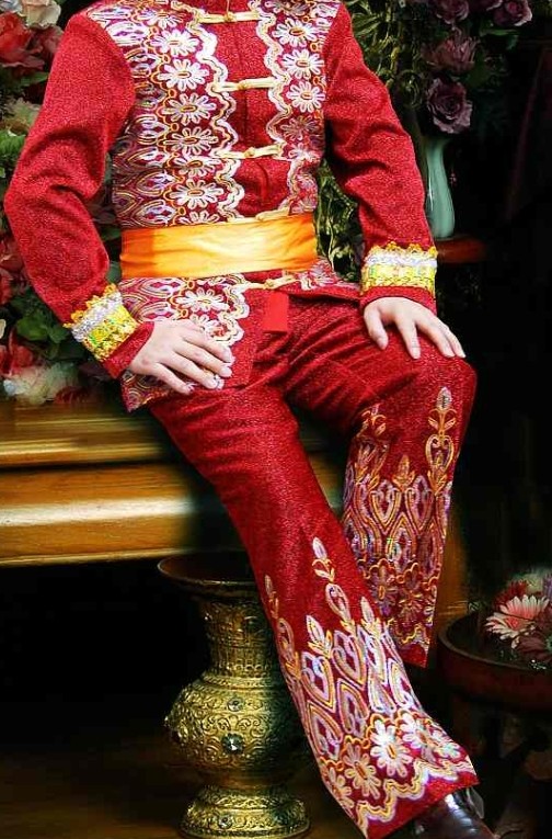 This magnificent traditional groom's outfit features a vibrant red jacket and trousers richly decorated with gold and white floral embroidery, representing joy and prosperity. The ensemble includes a decorative yellow waist sash and an elaborate, fan-style headdress that highlights the unique artistry of ethnic minority culture. Ideal for traditional wedding ceremonies, cultural festivals, and stage performances, this complete set provides an authentic and regal appearance.