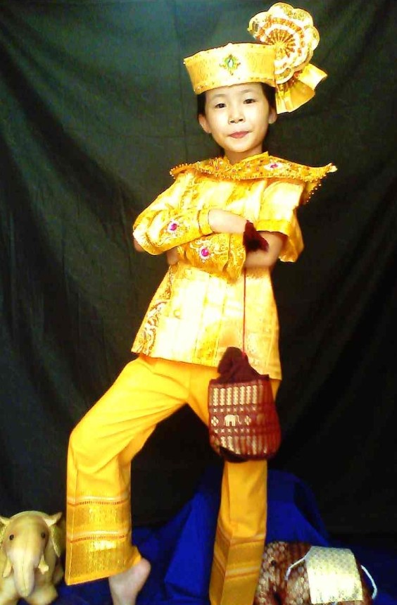 This stunning golden costume captures the elegance of traditional Thai royalty, featuring a shimmering satin tunic and matching trousers adorned with intricate detailing. The complete ensemble includes a majestic headdress, an ornate collar piece, and arm cuffs, creating an authentic look for young performers. Perfect for cultural dance performances, school plays, or festive celebrations, this outfit allows children to celebrate Asian heritage with pride and style.