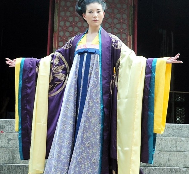 Step into the elegance of ancient China with this stunning Tang Dynasty-inspired Hanfu ensemble. Featuring a rich purple outer robe with gold floral embroidery and wide, flowing sleeves, this costume captures the grandeur of imperial court fashion. The high-waisted blue patterned skirt adds a graceful silhouette, making it perfect for traditional dance performances or historical photography. Crafted with attention to detail, this outfit is ideal for cultural festivals, cosplay events, or anyone wishing to experience the beauty of traditional Chinese heritage.