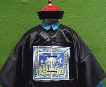 Step into history with this authentic-looking Qing Dynasty official robe, crafted from high-quality black fabric featuring contrasting light blue cuffs and a stiff collar. The centerpiece is the intricate embroidered Mandarin square on the chest, traditionally used to denote rank, making it perfect for historical reenactments, Peking Opera, or theater productions. This complete ensemble includes the traditional black hat with a red finial, offering a ready-to-wear solution for cultural performances and traditional Chinese photography. Ideal for collectors of traditional culture and actors seeking a detailed, respectful representation of ancient Chinese attire.