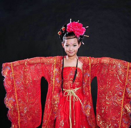 Step into history with this exquisite red Hanfu costume, designed specifically for young girls to embody the elegance of ancient Chinese princesses. Crafted with vibrant red fabric and adorned with intricate gold embroidery, this traditional outfit features flowing wide sleeves that are perfect for classical dance performances. The ensemble includes a matching floral headpiece, completing the authentic look that is ideal for cultural festivals, stage shows, or special photo shoots. Celebrate rich heritage and timeless beauty with this stunning traditional attire that brings ancient stories to life.