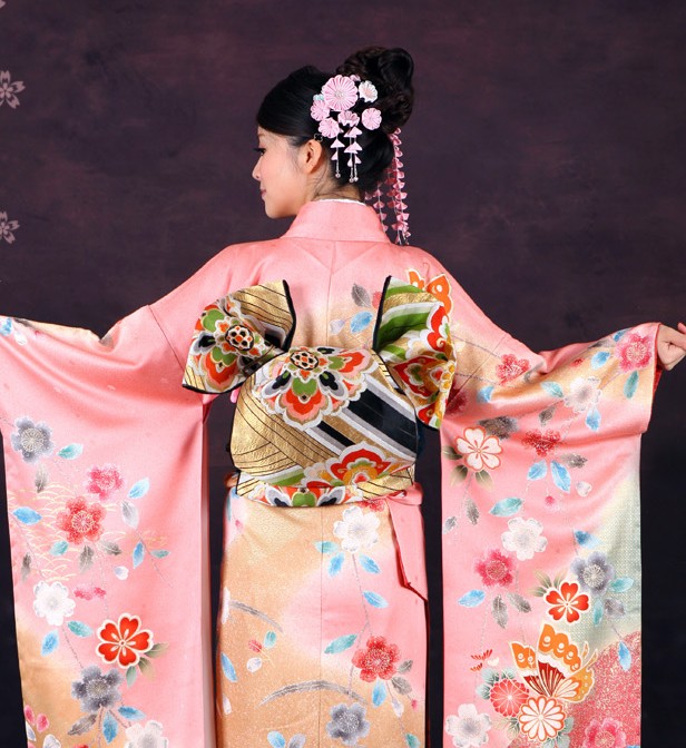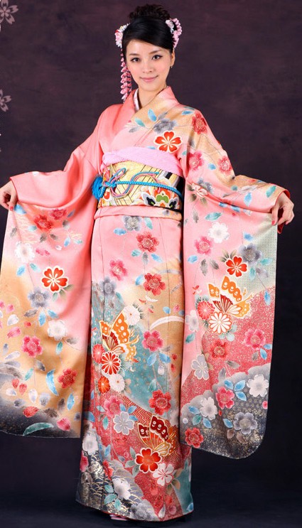 Embrace the elegance of Japanese tradition with this stunning pink floral kimono, featuring intricate designs of cherry blossoms and butterflies that symbolize beauty and renewal. Crafted from high-quality fabric with a lustrous sheen, this garment includes a decorative wide obi sash and long furisode sleeves perfect for formal occasions. Ideal for cultural festivals, tea ceremonies, stage performances, or photography, this complete set allows you to experience the sophisticated charm of authentic Asian attire. The vibrant color palette and detailed patterns make it a standout choice for anyone looking to celebrate Japanese heritage.