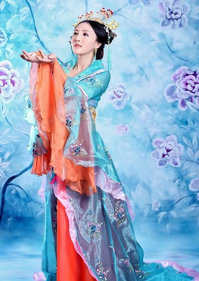 Step back in time with this stunning Tang Dynasty-inspired Hanfu, featuring the ethereal aesthetic of the Dunhuang Flying Apsaras found in ancient murals. Crafted from flowing, sheer fabrics in vibrant turquoise and orange, this ensemble is adorned with intricate floral embroidery and colorful ribbons that mimic movement. Perfect for traditional dance performances, cultural festivals, or artistic photography, this outfit captures the elegance of ancient Chinese court attire. The look is complemented by elaborate gold hair accessories featuring dangling pearls and beads to complete the regal, historical appearance.