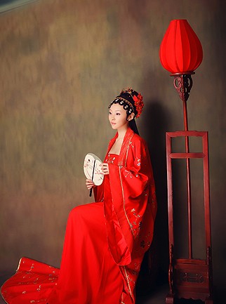 This exquisite red Hanfu captures the grandeur of the Tang Dynasty with its flowing wide sleeves and intricate gold floral embroidery. Designed for brides and performers, this traditional Chinese costume features a majestic long train and layered silhouette that exudes elegance. The vibrant red fabric symbolizes joy and prosperity, making it an ideal choice for weddings, cultural festivals, and historical photography. Crafted with attention to detail, this ancient attire allows women to immerse themselves in the beauty of classical Chinese heritage.