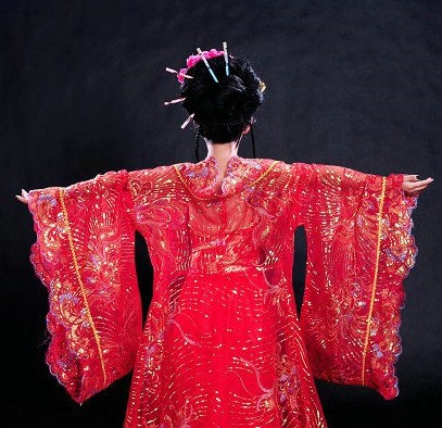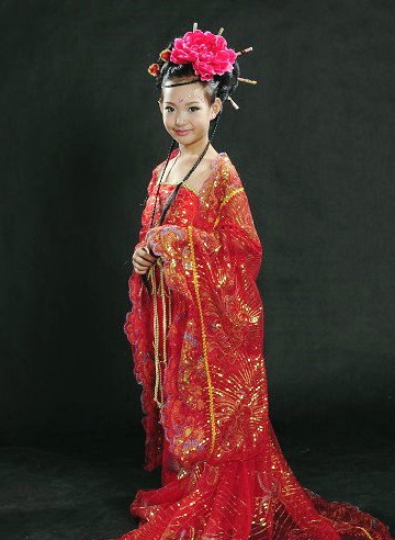 This exquisite traditional Chinese Hanfu costume features a vibrant red gown with intricate gold embroidery, capturing the elegance of Tang Dynasty palace fashion. The flowing wide sleeves and layered skirt are designed to enhance movement, making it perfect for classical folk dance performances and stage productions. Crafted with attention to detail, this outfit celebrates ancient Chinese culture and is ideal for Lunar New Year celebrations or cultural festivals. The ensemble includes traditional hair accessories to complete the authentic look of a young oriental princess.