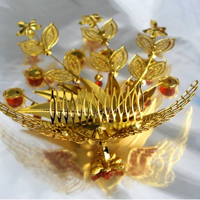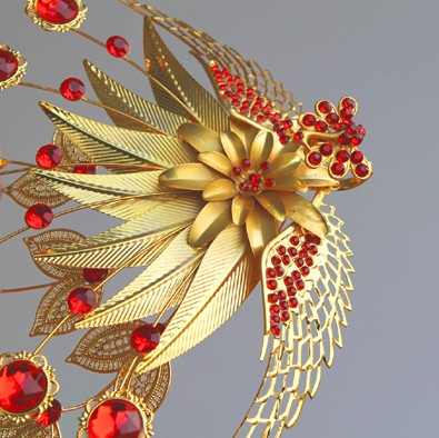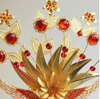 This stunning traditional Chinese hairpin features an intricate gold phoenix design adorned with sparkling red gemstones and elegant lotus motifs. Crafted from high-quality gold-plated metal, the piece showcases detailed filigree wings and a central floral arrangement that adds regal elegance to any updo. Perfect for brides wearing Hanfu or Qipao, this accessory symbolizes good fortune and grace, making it an ideal choice for weddings and cultural festivals. The classic red and gold color scheme captures the essence of ancient Oriental beauty, serving as a breathtaking statement piece for cosplay or special occasions.
