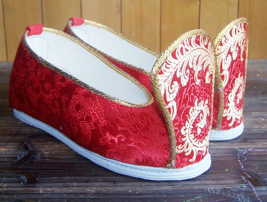 These exquisite traditional Chinese shoes feature vibrant red brocade fabric adorned with intricate gold embroidery, showcasing classic Eastern aesthetics. Designed with a durable white cloth sole and a supportive high back, they provide comfort while maintaining an authentic historical look. Perfect for pairing with Hanfu costumes, these shoes are ideal for traditional weddings, stage performances, and cultural festivals. Embodying ancient craftsmanship, they add a touch of elegance and auspicious charm to any traditional attire.