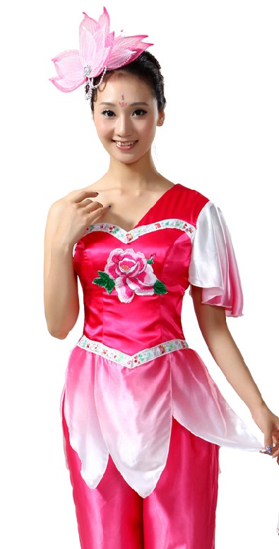 Elevate your stage presence with this exquisite women's Chinese folk dance costume, featuring a vibrant pink-to-white gradient satin fabric that flows beautifully with every movement. The ensemble includes a stylish draped top adorned with a delicate lotus motif, paired with wide-leg trousers and a matching floral headpiece for a complete traditional look. Perfect for Yangge dancing, fan dances, and cultural festivals, this outfit captures the elegance of Chinese heritage while ensuring comfort and flexibility for dynamic performances.