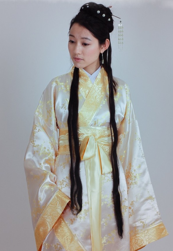 Step into the elegance of ancient China with this exquisite white and gold Hanfu, crafted from lustrous fabric featuring delicate floral brocade patterns. This traditional ensemble includes a cross-collar upper garment with flowing wide sleeves and a matching sash, perfectly capturing the graceful silhouette of historical Han Dynasty attire. Ideal for cultural festivals, tea ceremonies, stage performances, or immersive cosplay, this costume allows you to experience the timeless beauty of Chinese heritage. The intricate gold design and classic cut make it a stunning choice for photography and celebrating traditional aesthetics.