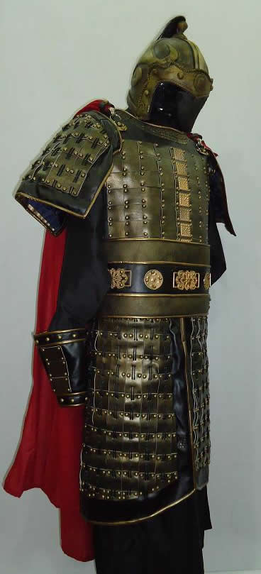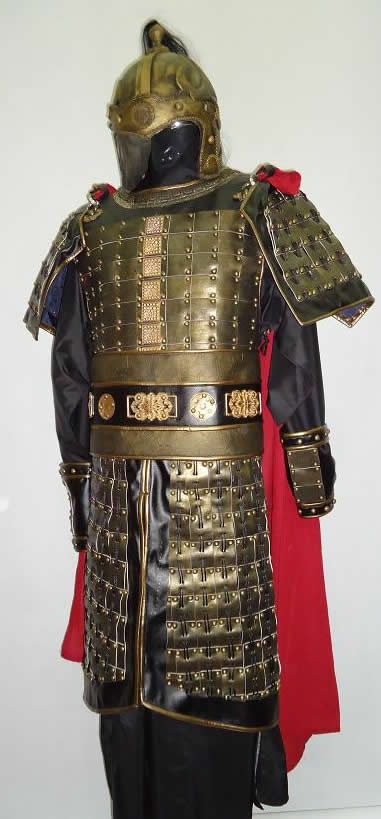 Immerse yourself in history with this stunning traditional Chinese Ming Dynasty general armor set, designed for authentic historical reenactment and high-end cosplay. Crafted with intricate lamellar scales and durable accents, this full-body suit includes a detailed crested helmet, protective shoulder guards, and an ornate waist belt. The striking bronze and dark green color palette, accented with bold red fabric, captures the majestic essence of ancient Chinese military might. Perfect for stage performances, LARP events, or as a collectible display piece, this costume allows you to embody the spirit of a legendary commander.