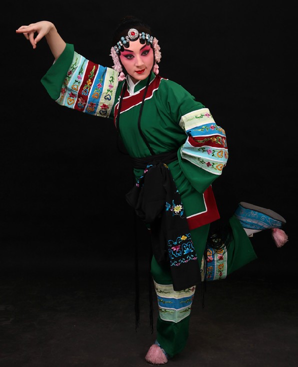 This authentic Chinese opera costume features a striking green robe with red trim and elaborate embroidery on the cuffs and pants, tailored specifically for female Dan roles. Made from durable, high-quality materials, this complete ensemble includes a traditional headdress and footwear, ensuring a professional and dramatic look for stage performances. It serves as a beautiful representation of traditional Chinese heritage, ideal for cultural exhibitions, theatrical productions, and dedicated opera enthusiasts.