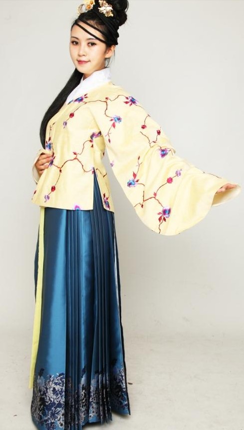 Embrace the elegance of ancient China with this exquisite Ming Dynasty-style Hanfu set, featuring a delicate pale yellow cross-collar top adorned with vibrant floral embroidery. The ensemble is paired with a flowing, deep blue pleated skirt that showcases intricate floral patterns near the hem, creating a striking and regal color contrast. Crafted from high-quality, smooth fabrics that drape beautifully, this costume is perfect for traditional festivals, cultural performances, or historical cosplay photography. Experience the timeless beauty of Chinese heritage through this authentic and graceful attire designed for the modern woman.