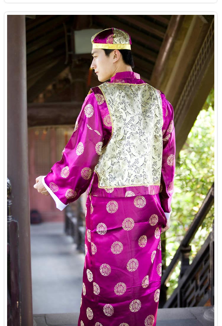 This exquisite men's costume features a vibrant purple robe inspired by Qing Dynasty nobility, complete with a matching embroidered skullcap. The garment showcases luxurious gold brocade medallions scattered across the rich fabric and an ornate, cream-colored chest panel that signifies high status and elegance. Perfect for traditional Chinese weddings, stage performances, cultural festivals, or historical cosplay, this outfit authentically captures the grandeur of ancient Chinese aristocracy.