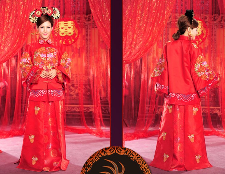 Celebrate your special day with this exquisite Traditional Chinese Wedding Qun Kwa, featuring a vibrant red hue that symbolizes luck and joy. The outfit showcases intricate gold and multi-colored embroidery on high-quality fabric, highlighting auspicious floral motifs and traditional patterns. Designed with a classic Mandarin collar and elegant wide sleeves, this two-piece set includes a fitted jacket and a flowing skirt for a regal silhouette. Perfect for the tea ceremony or the main wedding banquet, this bridal gown honors ancient customs while ensuring the bride looks stunning.