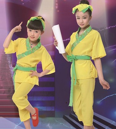 This vibrant yellow and green costume set captures the essence of traditional Chinese attire, featuring a classic cross-collar top with decorative green trim. Designed for comfort and movement, the outfit includes matching cropped pants and a flowing sash, making it ideal for stage performances and cultural festivals. The ensemble is completed with a matching headpiece, offering an authentic ancient look perfect for dance recitals or historical dress-up. Crafted from breathable fabric, this traditional Hanfu-style clothing allows children to explore Chinese heritage with elegance and ease.