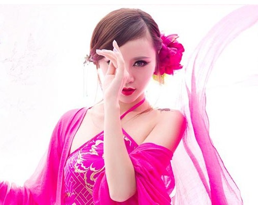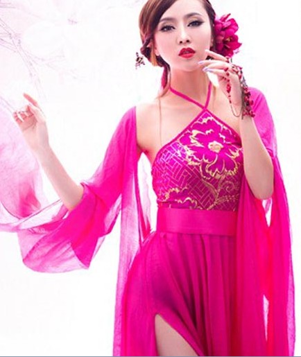 This stunning bright pink costume captures the elegance of traditional Chinese folk dance with its vibrant hue and intricate gold embroidery. Featuring a halter-neck top adorned with floral motifs and a flowing sheer shawl, it allows for graceful, sweeping movements on stage. Perfect for Yangge dancing, fan dances, and cultural performances, this outfit is designed to make a bold visual impact under stage lights. Crafted from lightweight, breathable fabrics, it ensures comfort for dancers during energetic routines while maintaining a regal and festive appearance.