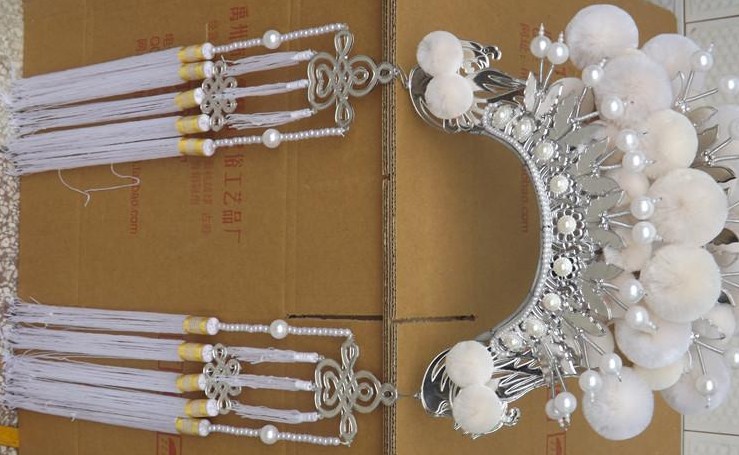 This exquisite traditional Chinese headdress features a stunning silver filigree crown adorned with plush white pom-poms and lustrous pearls. Designed for Peking Opera and Hanfu enthusiasts, it includes elegant long tassels that sway with movement, adding dramatic flair to any performance. Perfect for stage plays, cultural festivals, or historical cosplay, this accessory captures the regal elegance of ancient Chinese royalty.