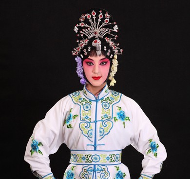 Immerse yourself in the elegance of ancient China with this exquisite white Peking Opera costume, featuring intricate blue and green floral embroidery on premium fabric. Designed for the dynamic "Daomadan" warrior role, this ensemble includes a stunning beaded headdress and a traditional spear with vibrant red tassels for authentic stage presence. Perfect for cultural festivals, theatrical productions, or cosplay events, this outfit captures the dramatic beauty and martial spirit of traditional Chinese performing arts.