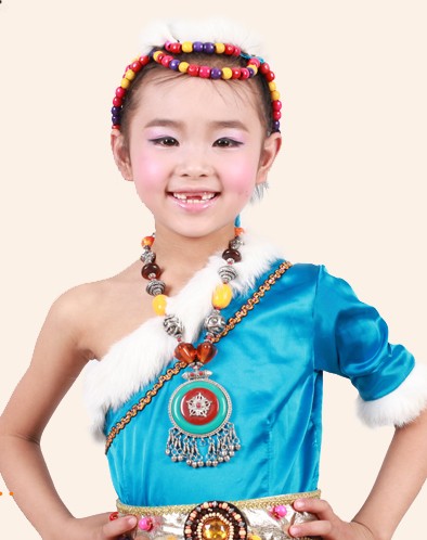 This vibrant blue costume captures the elegance of traditional Mongolian folk dance, featuring intricate gold embroidery and a regal beaded headpiece. The dress is designed with a flared, tiered skirt edged in plush white fur trim, ensuring graceful movement for young dancers. Perfect for stage performances, cultural festivals, or themed events, this outfit allows children to celebrate ethnic heritage in style. The look is completed with traditional black boots adorned with gold patterns, offering an authentic nomadic aesthetic.