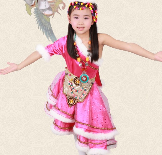 This vibrant pink Tibetan dance costume is designed for young girls to showcase traditional culture with elegance and flair. The outfit features a soft, velvet-like dress adorned with plush white faux fur trim on the sleeves and hem, creating a striking contrast. It comes complete with an elaborate, colorful beaded necklace and headpiece, along with a sparkling silver waist ornament detailed with jewels and coins. Perfect for folk dance recitals, cultural festivals, and stage performances, this ensemble allows children to celebrate heritage in comfort and style.