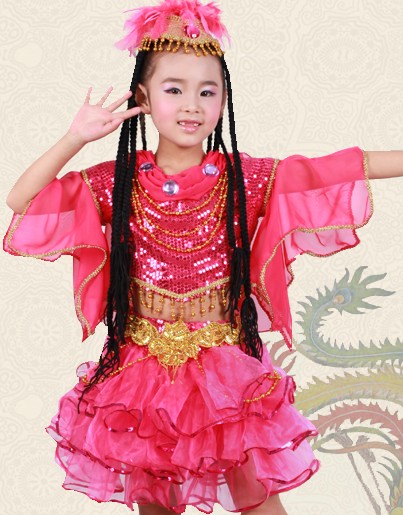 This vibrant pink costume captures the essence of traditional Xinjiang folk dance, designed specifically for young performers. It features a dazzling sequined top and an elaborate feathered headpiece adorned with dangling gold beads for a festive, authentic look. The ensemble is completed with long, styled braids that enhance the ethnic aesthetic. Ideal for stage performances, cultural festivals, and school events, this outfit allows children to celebrate rich Chinese heritage with elegance and joy.