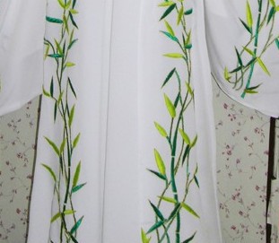 This exquisite white Hanfu features intricate green bamboo embroidery on the scalloped collar and wide sleeves, embodying the graceful aesthetics of ancient China. Crafted from flowing, high-quality fabric, the garment is designed to accentuate movement, making it perfect for classical dance or stage performances. The bamboo motif traditionally symbolizes resilience and noble character, adding deep cultural significance to the attire. Ideal for cultural festivals, historical reenactments, or photography, this costume allows wearers to showcase the timeless elegance of traditional Chinese heritage.