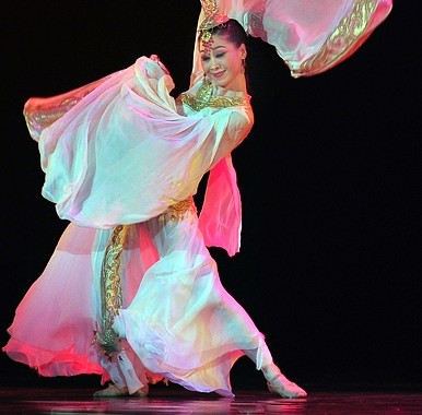 This exquisite white dance costume captures the ethereal beauty of traditional Chinese classical dance with its flowing silhouette and intricate detailing. The ensemble features a heavily embellished bodice with gold embroidery and sequins, paired with lightweight, billowing trousers that accentuate every movement. It includes a matching ornate headpiece that adds a touch of royal elegance and authenticity to the overall look. Perfect for stage performances, cultural exhibitions, and dance competitions, this outfit allows dancers to express grace and fluidity.