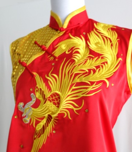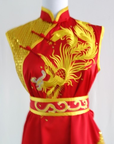 This exquisite red martial arts uniform features a majestic gold phoenix embroidery, a symbol of grace and high virtue in Chinese tradition. Designed for visual impact, the top showcases a unique gold sequin shoulder panel and traditional frog buttons against a smooth, high-quality satin finish. Ideal for Wushu competitions, Tai Chi demonstrations, or cultural stage performances, this outfit perfectly blends authentic heritage with striking aesthetic appeal.