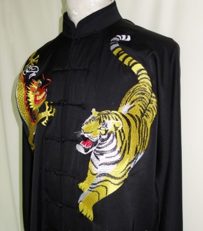 This striking black martial arts uniform features intricate golden embroidery of a dragon and tiger, symbolizing the harmonious balance of power and agility in traditional Chinese culture. Crafted from a smooth, silk-like fabric, the set includes a long-sleeved top with a classic Mandarin collar and traditional frog buttons, paired with loose-fitting trousers for unrestricted movement. Ideal for Tai Chi, Kung Fu, or Wushu practice, this costume offers both comfort and style for performances and daily training. The detailed cloud motifs on the pant legs add an authentic touch, making it a perfect choice for cultural festivals or meditation sessions.