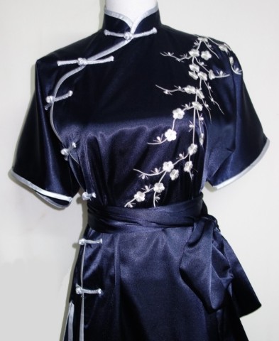 Crafted from lustrous navy blue satin, this traditional Chinese Kung Fu uniform set features a classic mandarin collar and elegant frog button closures for an authentic look. The outfit is beautifully adorned with delicate white plum blossom embroidery on the chest and pant leg, symbolizing resilience and purity in Chinese culture. Designed for comfort and fluid movement, this breathable two-piece suit is perfect for Tai Chi, Wushu practice, martial arts performances, or casual cultural wear. The matching trousers offer a relaxed fit, ensuring ease of motion during training or daily activities.