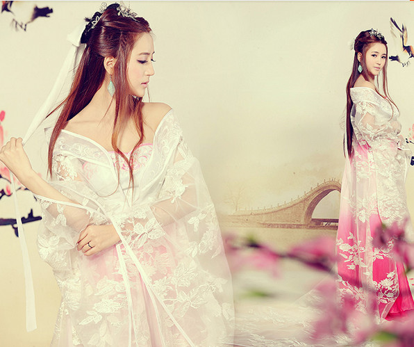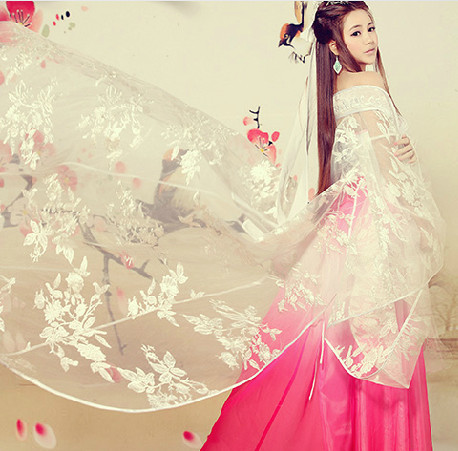 Step into the world of ancient elegance with this stunning Hanfu ensemble, featuring a mesmerizing pink-to-red gradient skirt that flows gracefully. The outfit is complemented by a delicate, sheer white cloak adorned with intricate floral lace embroidery, evoking the ethereal beauty of a Chinese fairy. Crafted from lightweight, breathable fabrics, this traditional costume is perfect for stage performances, cultural festivals, or artistic photography. Embrace the timeless charm of Chinese heritage with this exquisite attire designed to make you feel regal and enchanting.