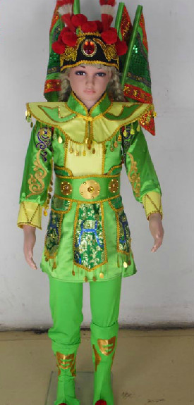 This vibrant green Chinese Peking Opera costume is designed for young performers to embody the spirit of a traditional warrior general. The outfit features exquisite gold embroidery on a silky tunic and trousers, paired with an elaborate headdress adorned with long pheasant feathers that symbolize martial prowess. Perfect for school cultural festivals, stage plays, or Chinese New Year celebrations, this complete ensemble includes matching boots to ensure an authentic look. Crafted with attention to detail, it allows children to experience the rich heritage of Chinese theater through immersive role-play.