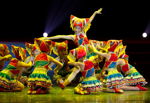 Kids Girls Chinese Ethnic Folk Dance Costume Traditional Miao Minority Stage Performance Dress with Colorful Ribbons