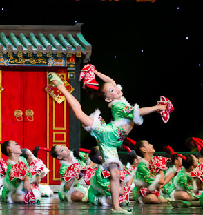 This vibrant costume set features a traditional green floral dress designed for young girls performing Chinese folk dance. The ensemble includes large, elaborate pink flower fan props that create a stunning visual effect of blooming peonies on stage. Crafted from lightweight, breathable fabric, the outfit ensures comfort and ease of movement during energetic routines and cultural celebrations. Perfect for school performances, dance competitions, and cultural festivals, this attire beautifully showcases the elegance of Chinese traditional arts.