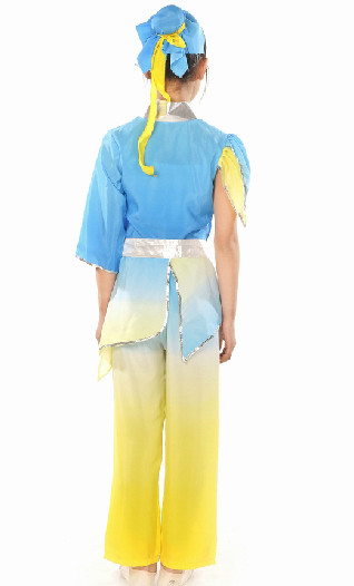Elevate your young performer's stage presence with this stunning Chinese folk dance costume, featuring a beautiful blue-to-yellow gradient tunic and matching pants. Designed for comfort and agility, the lightweight fabric and secure silver sash allow for effortless movement during Yangge, fan, or ribbon dances. Ideal for cultural festivals, school recitals, and competitions, this traditional ensemble beautifully showcases the elegance of Chinese heritage.
